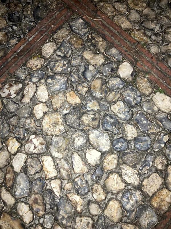 No two flints should touch. They should sit as close together as possible, but without crowding, so that mortar does its job without dominating the surface.